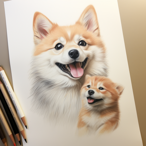 pencil, very cute, shiba dog, smile, with black cat, 2d anime, in osaka