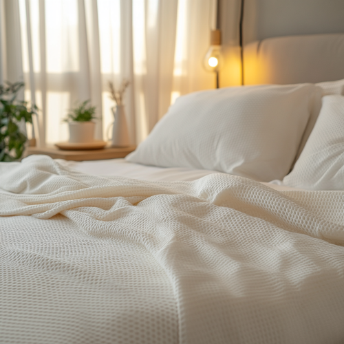 A white bed blanket that is laid down flat with NO wrinkels the bed has been made up well it looks like a stock image with a bright lit room with a little zoom on the blanket 4k --style raw