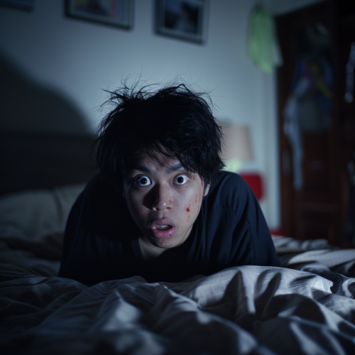 create an image of a dark dreamy bedroom with a peaceful young brown haired woman sleeping in her bed beside a night stand with a small lamp