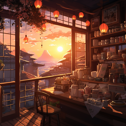 late night tea shop indoors sunrise colours anime