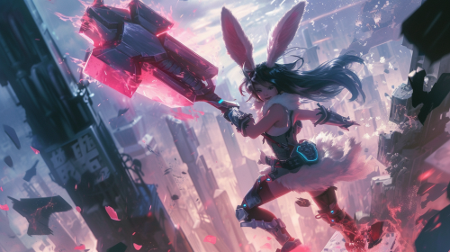 Action scene swinging down a gigantic hammer, anime illustration, digital art, anime coloring, rabbit ears, battle scene, cool pose, whole body, concept art, small chest, futuristic sci-fi Chinese girl fighting with a gigantic weapon, action scene , long hair, fancy girl, cute girl, fluffy, fluffy, anime illustration, whole body, looking at camera, cool pose, cyber mechanic SF, FF, simple background, future fashion, advertising image, mechanical equipment robot armor, --ar 16:9 --v 6.0