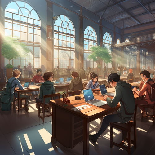 Image of a school with groups of students. Some doing chemistry, some doing computer classes, some doing sports and so on. Anime style.