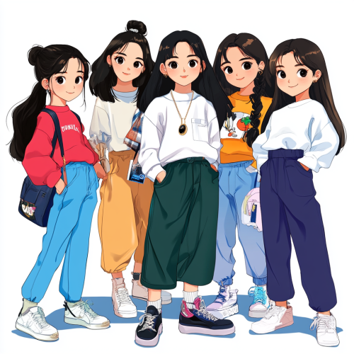 Anime style, a group of Asian teenage girls with different hairstyles, each wearing unique streetwear outfits and shoes, full body view, ultra detailed, minimalist background --p pn1eq8j