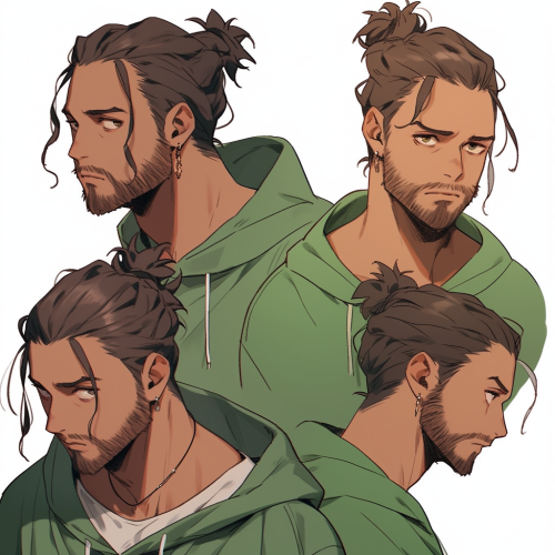 Anime style 26 year old caucasian male, brown man bun, medium length beard, green eyes, light blue hoodie