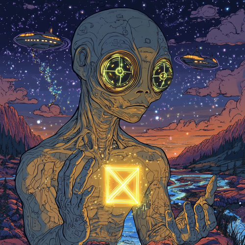 grey alien looking into hands, holding a glowing bright levitating microchip in shape of a large X, UFO and 2 rivers and 808 symbol in background in style of matt furie