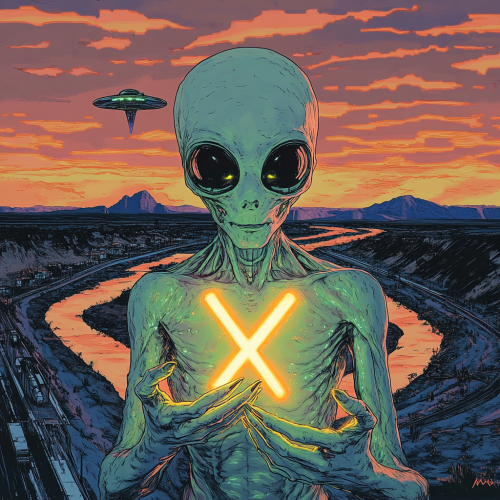 grey alien looking into hands, holding a glowing bright levitating microchip in shape of a large X, UFO and 2 rivers in background in style of matt furie