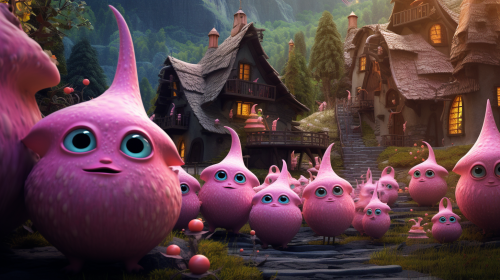 close up anime picture of cute alien villagers, cute village background, beautiful alien landscape, --ar 16:9