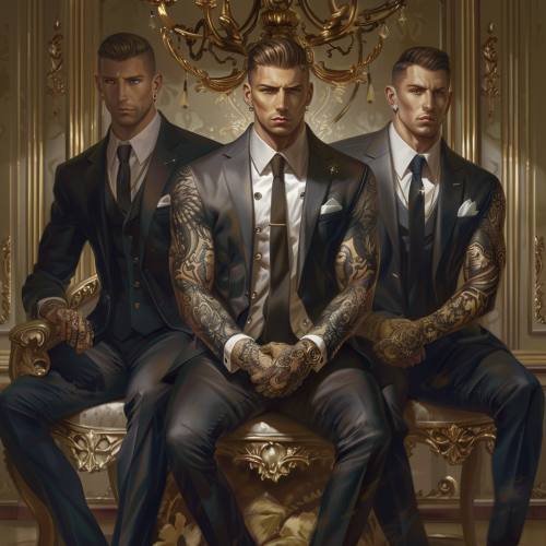 /imagineMarketing, managers, gay young handsome 3 White male executives, less covered, anime style, fantasy style, --v 6.0