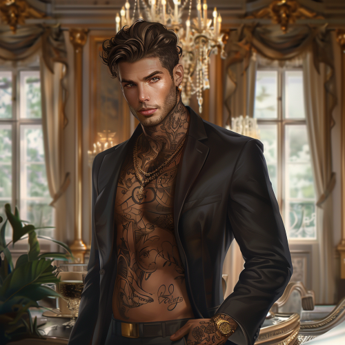 Marketing managers, gay young handsome White male executives, tatoo all over body and chest, anime style characters, a luxury room, --v 6.0
