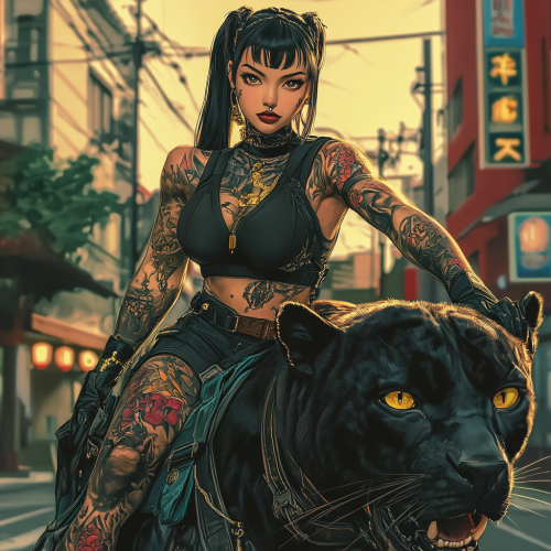 impeccably beautiful anime woman covered in tattoos in her mid twenties wearing a modern outfit riding a black panther walking towards the camera; in the style of Akira