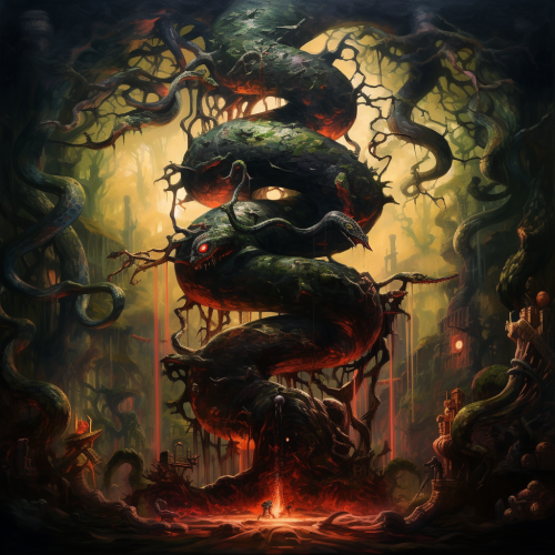 A demonic snake hanging on a giant surreal and over glitched knowledge tree, trippy hallucinations aestetics, strong colors, blurry lights, epic perspective,intricate details, oil painting, In the style of Johann Heinrich Füssli,