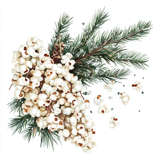 art composition of the popcorn garland and christmas tree branch, in the style of water colour painting, on the white background, aesthetic, illustration, cozy ar 1:1