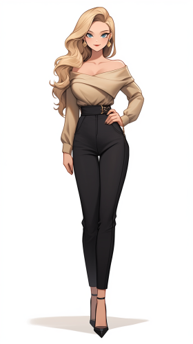 beautiful anime woman, blonde brown hair, straight hair, blue eyes, heavy eye makeup, very skinny, somewhat nerdy, full body pose, self - confident, dangerous and evil, deadly and lethal, beautiful makeup, vibrant smile, beautiful and supermodel woman, beautiful proportions with wide round hips, tiny waist, impressive and apparent chest, piercing eyes, high contrast, hyperdetailed, curvaceous body, expression of the body, style of Frank Frazetta, Guilliem March, J Scott Campbell, Michael Turner, and Adam Hughes, decadent picture, --ar 9:16 --stylize 250 --niji 5