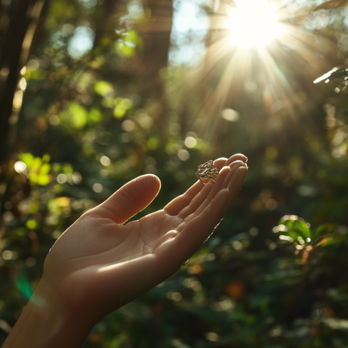 Beautiful female hand is stretched out against the background of the forest. On the hand is a small fantasy ring. Fashion style photography of premium jewelry. The sun is shining brightly