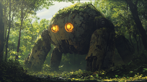 Giant robot abandoned in the forest, illuminated eyes, covered in nature, quiet place, forest, clear sky, some geographies on the robot, anime style --ar 16:9