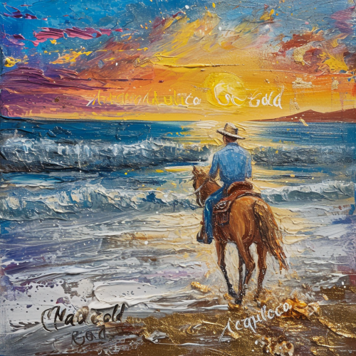 "Acapulco Gold" Weight .30 script centered, painted image of a cowboy on a beach, words Acapulco Gold in text title centered, in the style of romantic fantasy, hispanicore, adventure pulp, unicorncore, pictorial, wimmelbilder, tondo. cannabis. marijuana, kush, beach, gold bars, sunset, waves 27:40 --v 6.0