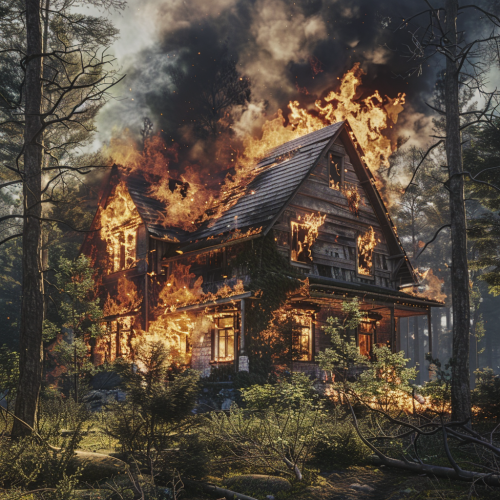 Ancient forest burning down, large trees, tall flames, night time, photorealistic,