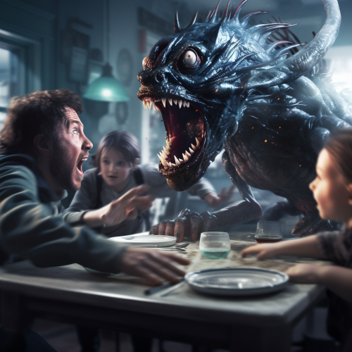 tiny xenomorph running across the dinner table with people angrily shouting at it