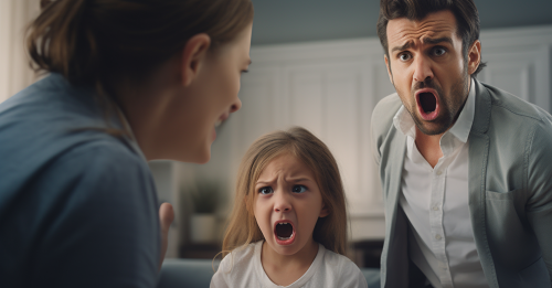 Annoying 6 year old girl is shouting at her parents, who look sad and upset. modern setting, white walls and light color scheme, ultra realistic --ar 100:52