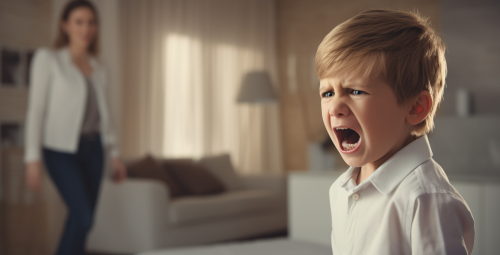annoying 6 year old child is arguing with parents. modern setting, white walls and light color scheme, ultra realistic --ar 200:102