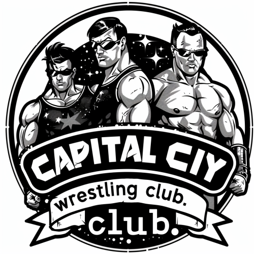black and white logo with styalized wrestlers and the words "capital city wrestling club."
