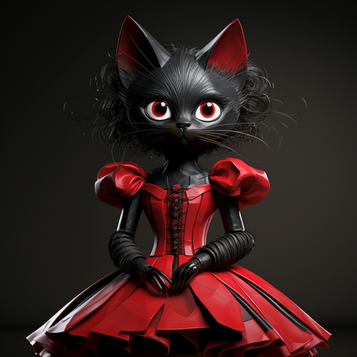 Generate a realist 3D three-dimensional black cat, very anthropomorphic, wearing a red dress