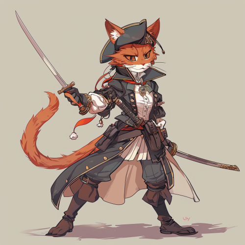 Anthropomorphic orange 20-something cat-girl, with a wolf haircut, wearing a 17th century Spanish marine officer outfit, standing in a dueling pose, wielding a rapier in her left hand-paw and a thin and light dagger in her right, drawn in the style of Japanese animation --v 6.0
