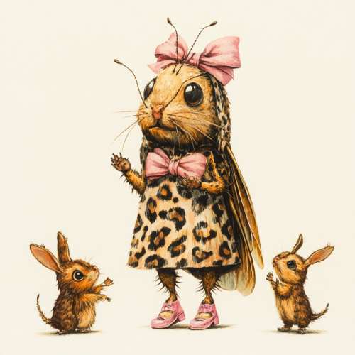 a cockroach in a printed cheetah dress, wearing very pretty pink slippers, with a bow in her hair, talking to other cute little animals the same size as her for a children's book image