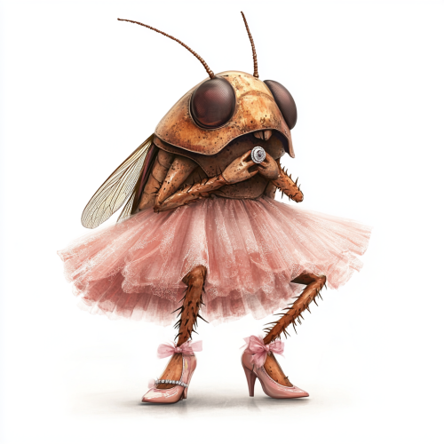 a brown cockroach, with only two legs, high heel shoes and seven pink tulle skirts, with a graduation ring in her hand, crying very cute for a children's book image on a white background