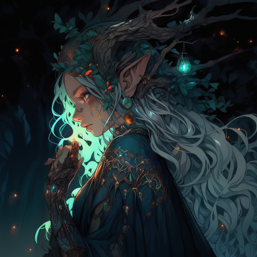 Grimdark mystic ominous amazing elf using wild magic, anime style, high fantasy, digital art, masterpiece painting, ultra detailed, ultra high definition, 8K resolution, 3D shading, superior quality, cover illustration, complex design, luminous highlights, rich vibrant colours, hyperrealistic, meticulously hyper detailed, high contrast, artstation --niji 5