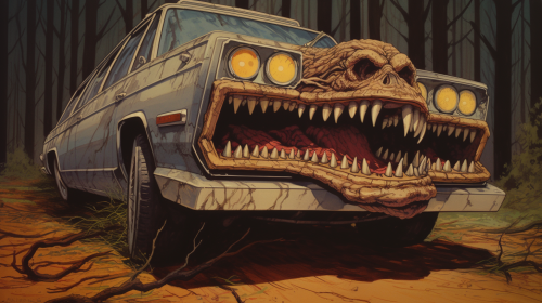 a 1980s station wagon, wood paneling, anthropomorphic, mouth with sharp teeth, comic book, style of Frank Miller, --ar 16:9