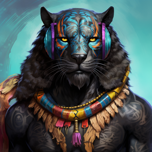 anthropomorphic black panther, wolf hybrid barbarian with colorful hippy influences realistic