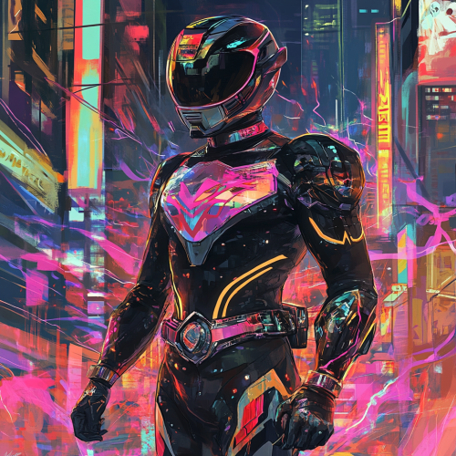 An early 90s anime illustration of a Power Ranger, helmet, featuring a sleek, modern outfit with unique patterns . He stands confidently in an urban setting, showcasing swirling, vibrant colors around him. The atmosphere is dynamic and energetic, capturing a blend of intensity and charisma.