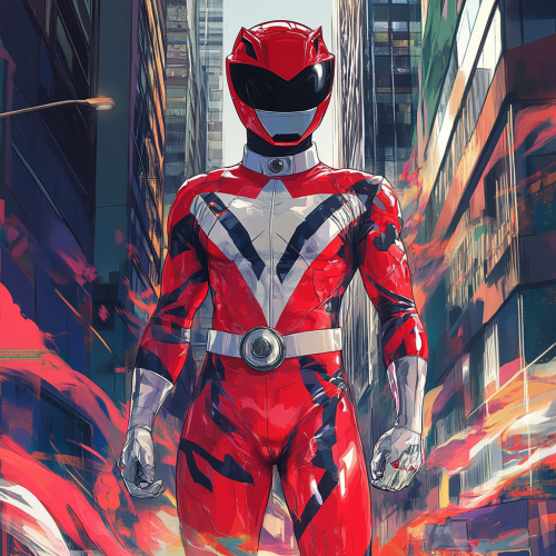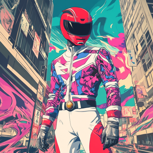 An early 90s anime illustration of a man, Power Ranger red helmet, featuring a sleek, modern outfit with unique patterns . He stands confidently in an urban setting, showcasing swirling, back ground vibrant colors around him. The atmosphere is dynamic and energetic, capturing a blend of intensity and charisma.