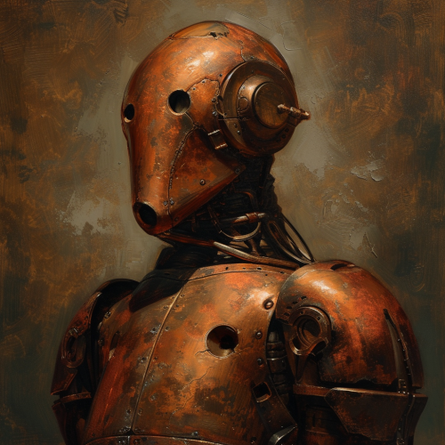 portrait of an anthropomorphic droid, copper armour and plating, stocky and short, D&D Warforged, humanoid metal face, oil painting, Frank Frazetta artwork style, HD, 8K, dramatic lighting, clear details, character design, --v 6.0