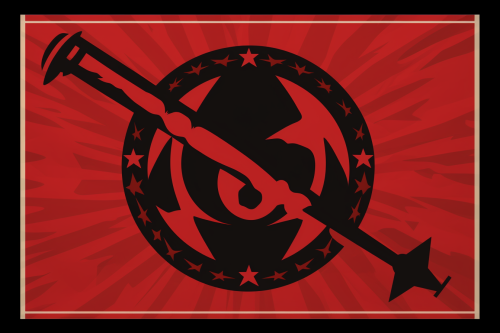a flag design for a country featuring hammer logo by benshaft, in the style of modular constructivism, antichrist, rangercore, vancouver school, the stars art group (xing xing), red, neo-pop iconography --ar 128:85