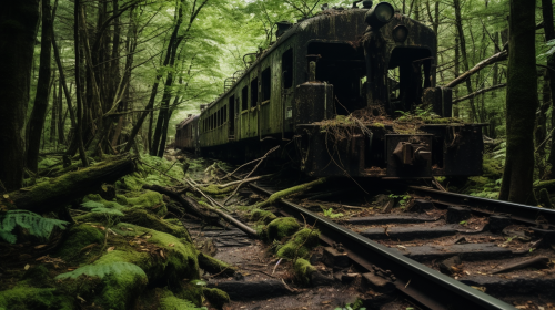 an abandoned logging train in the woods of the Northeast, in the style of Twin Peaks by David Lynch --ar 16:9