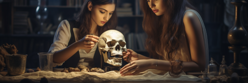Create a visual narrative of ancient Egyptian artifacts adorned with symbols suggesting extraterrestrial contact, with people unraveling the mysteries of these cosmic connections. Content: Egyptian artifacts, extraterrestrial symbolism, cosmic exploration. Medium: Digital sculpture. Style: Futuristic and historical, portraying the investigation of ancient cosmic symbolism. Lighting: Ethereal and mysterious. Colors: Earthy tones with celestial hints. Composition: Craft a three-dimensional representation of the intrigue surrounding Egyptian symbols. --ar 16:9 --v 5.1 --style raw --s 750