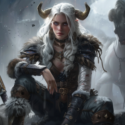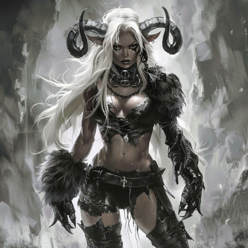 female half-beast fantasy warrior in a battle, adult woman, she has black horns, hooves and fur on legs, has white long hair and pale skin, she is big and strong with muscles, she is smart and angry, villian vibes, dark fantasy style, hd, detailed, realistic