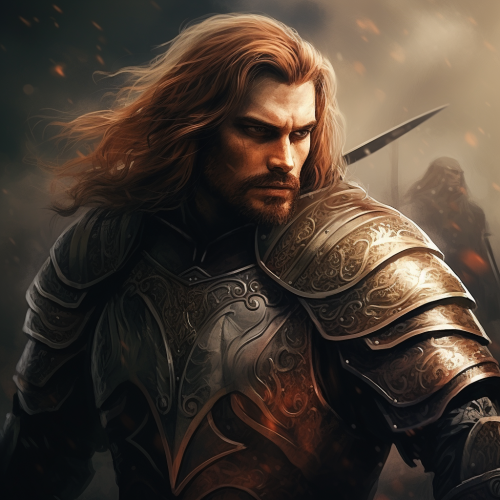 A handsome warrior captain with a muscular humanoid face and body with metallic bronze skin that hardens into armor with metallic hue, intricate tattoos of warrior achievements, clad in minimal dark leather attire with fur accents and royal blue royal cloak. Ultra realistic and finely detailed handsome face. He stands on a rocky edge, The humanoid with a barbarian sword, attractive and determined gaze embody resilience and strength, ready to face any challenge. UHD, 4K, --v 6.0