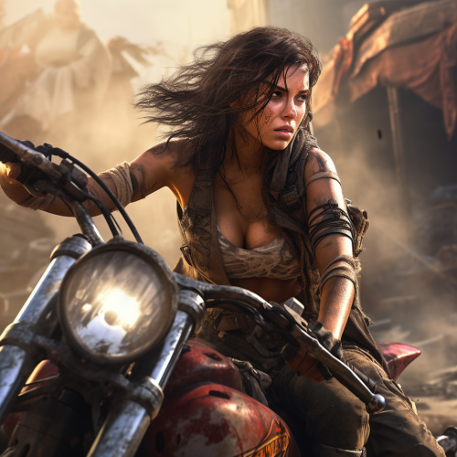 fleeing fleeing super villain on motorcycle in post apocalyptic streets running away from men in gray suits wielding weapons , sci-fi action movie poster