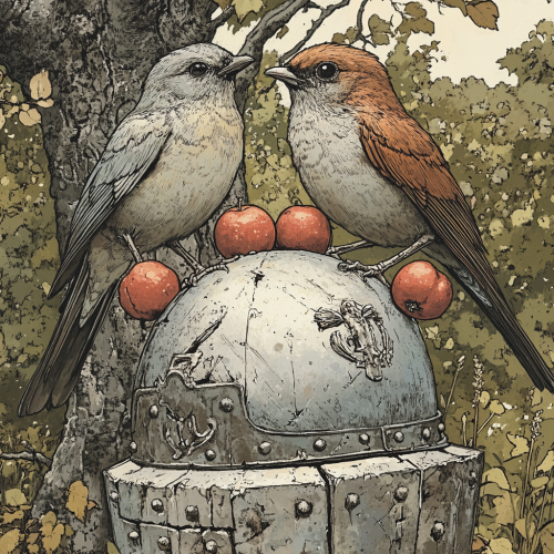 style is halftone Dot, Lo-fi, noisy, grainy, colored, art from the 1997 dark fantasy novel by Kentaro Miura, subjects are two songbirds perched next to each other on top of a tarnished knights helmet, close up, apple tree in the background, apples scattered on ground