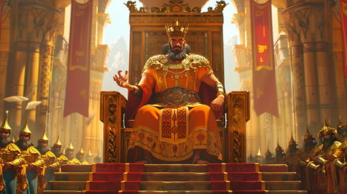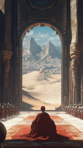 Timur (Tamerlane) sitting on a grand throne surrounded by intricate Persian designs and fierce warriors, deserts stretching into the distance beyond the royal hall, surreal, hyper-realistic, Ultra HD --ar 9:16