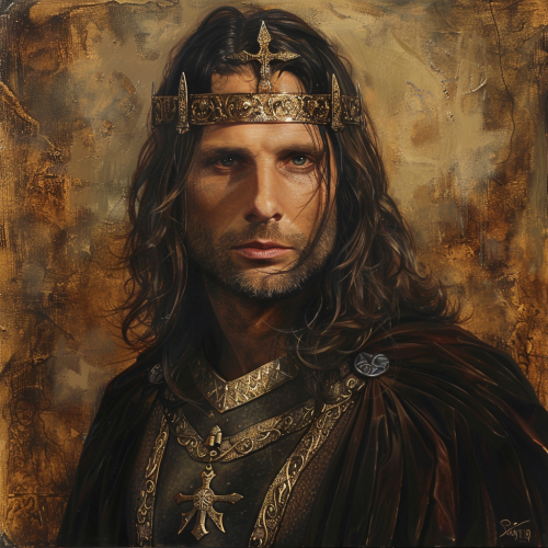 A surreal gothic horror scene in a dreamlike atmosphere where the character from the provided image is walking up to a grand throne room made entirely of marble. The room is filled with ornate wall hangings and tapestries of gold and purple, creating a regal and eerie ambiance. At the end of the room, a tall and proud golden throne sits on a raised dais, gilded with platinum. Resting on the throne's seat is a golden crown, set atop a soft violet pillow and adorned with priceless gems that sparkle faintly in the dim light. The player character, a figure wearing heavy furs and leather armor with a hood pulled low, walks slowly toward the throne. In one hand, they hold a small flame conjured from their fingertips, while their bow and arrows are slung across their back. The character's expression is calm yet determined, as if they are aware of the power and danger surrounding them. Beside the throne, Zantras the Kingmaker stands tall on the dais steps, watching the character approach. He is slender and handsome, wearing deep blue and black robes, with a simple sheathed dagger at his side. His presence is regal but unnerving, as though he belongs both to this world and beyond it. The overall scene exudes a gothic, haunting atmosphere with a blend of elegance and foreboding, as the character approaches their destiny.