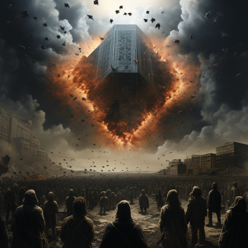 occultism, black cube surrounded by people, approaching war, planes, soldiers, explosions --v 5.2 --s 250