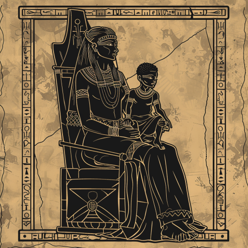 parchment style, front facing, full body, dark black Ancient Egyptian queen Mother sitting in throne with child prince in her lap, Black African, illustration