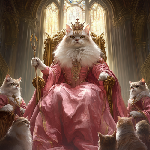 A regal British Longhair cat dressed in a pink gown sits majestically on a throne. Behind her, a grand European-style cathedral window casts soft light into the scene. The cat wears a crown and holds a scepter, exuding authority. Below, a group of loyal feline subjects kneel in reverence.