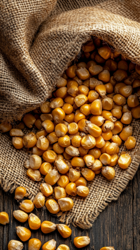 A high-quality, detailed image of cracked corn kernels used for animal and poultry feed. The scene should showcase a close-up of the corn, with visible texture and natural color variations. Include elements like a rustic wooden background or a burlap sack to emphasize its agricultural and feed purposes. The overall mood should convey freshness, naturalness, and suitability for animal nutrition. --ar 9:16