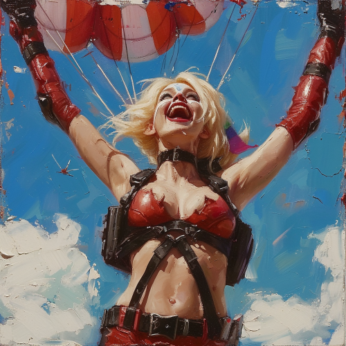 oil on canvas, Harley Quinn, closeup, low angle, parachute jump in the air --s 150 --v 6.0 --style raw