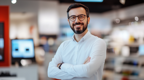 smiling SME looking to camera in modern bright technology store. blur technology store background Hyper realistic advertising photography --ar 16:9 --v 6.1